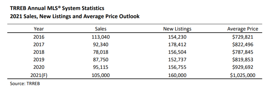 According to TRREB, 2020 was a roller coaster year with unpredictable ups and downs, but the second half of 2020 was marked by consecutive monthly records for home sales and average selling prices. The end result was the third best annual sales total on record and a new record for the average selling price. The suburbs experienced the strongest sales growth, especially in single-family homes with the average selling price topping out at almost $930,000.