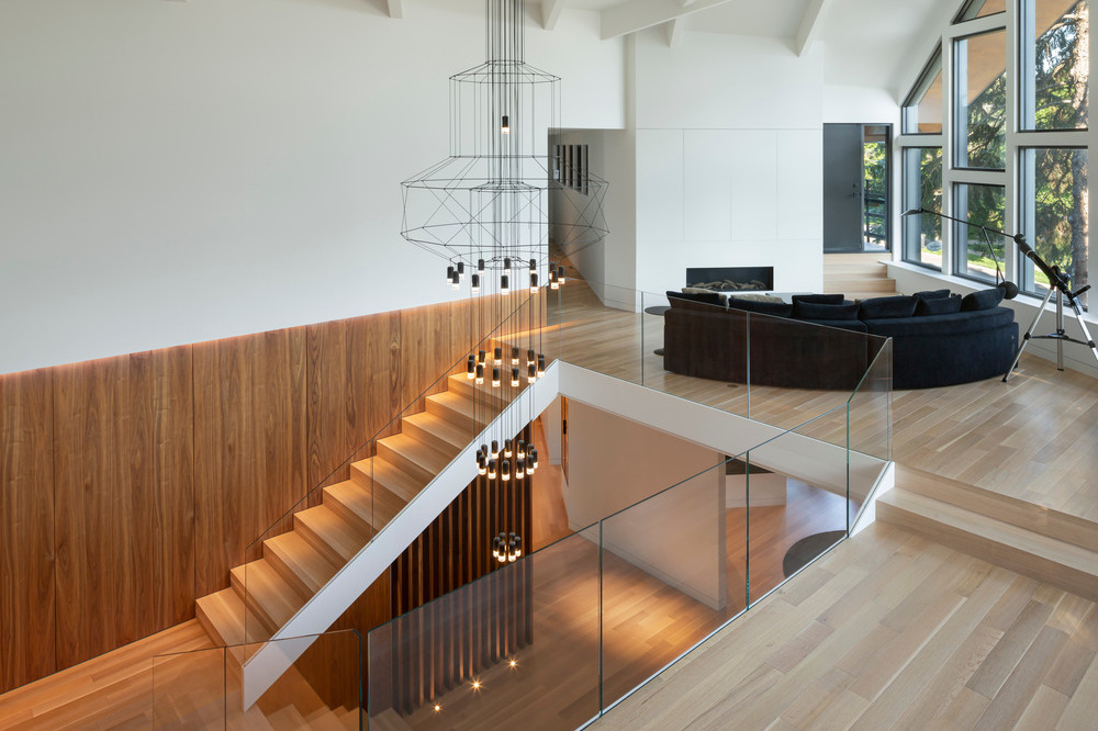 Upstairs, the mezzanine lounge room hosts a fireplace, a hidden television, and a huge double-story glass wall that offers a view of Montreal. A large playroom, three children’s bedrooms, and two bathrooms complete this level. The lower floor has, among other things, two guest bedrooms, a workout area, a workshop, and a double garage.