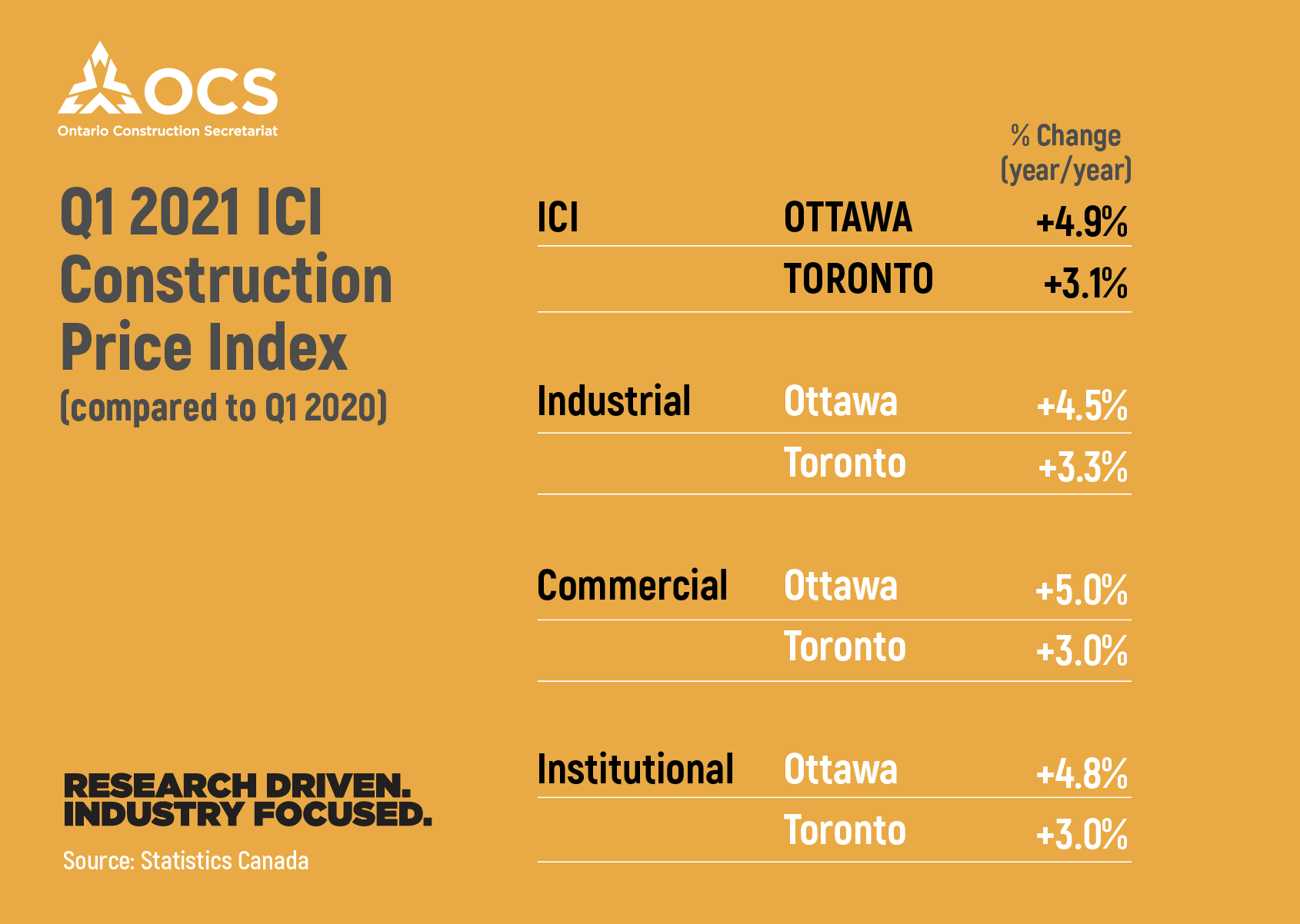 Statistics Canada’s building construction price index data for Q1 revealed a 4.9 increase in Ottawa’s ICI construction prices in the first quarter of 2021 over Q1 2020. This is the biggest increase among the eleven metro areas in Canada included in the index. Toronto’s prices increased by 3.0 per cent compared to last year’s first quarter. Ottawa also saw greater year-over-year price increases at the sector level relative to Toronto. Commercial building construction prices in Ottawa increased by 5.0 per cent compared to Q1 2020, while institutional prices increased by 4.8 per cent and industrial prices increased by 4.5 per cent. Toronto’s industrial building construction prices were up by 3.3 per cent in the first quarter over Q1 2020, while commercial and institutional prices were both up by 3.0 per cent.