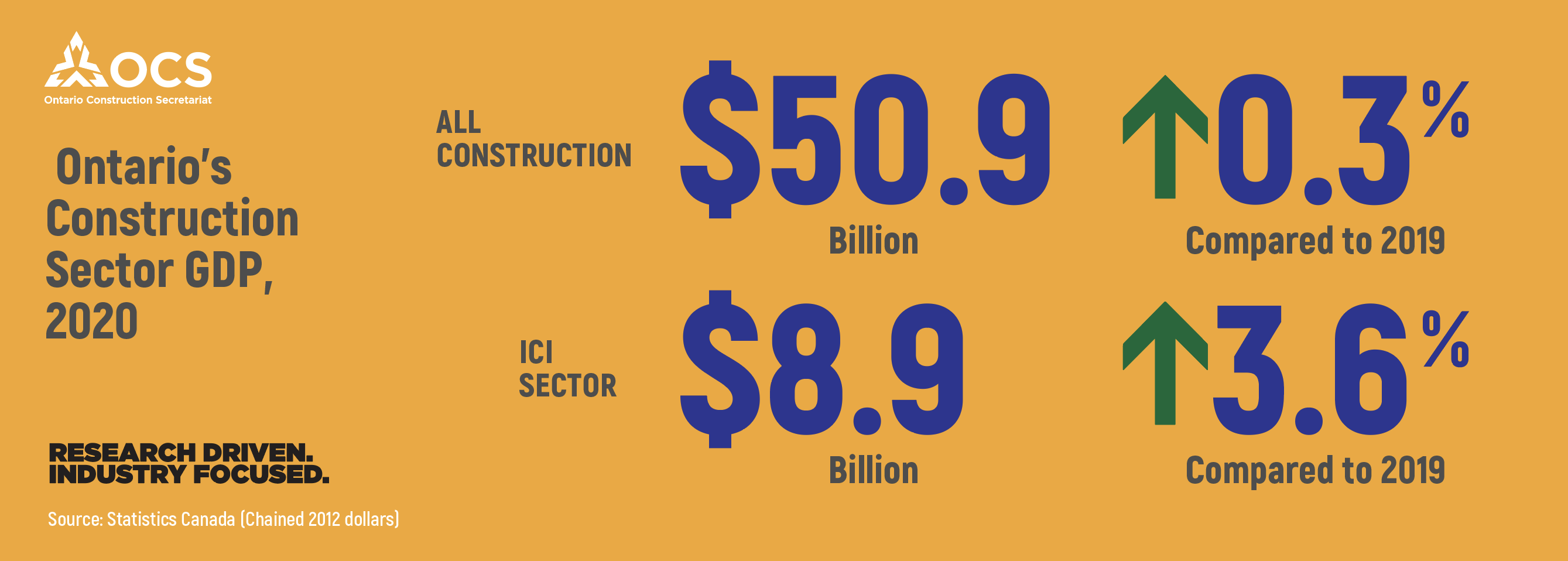The GDP of Ontario’s ICI construction sector increased by 3.6 per cent in 2020, up to $8.9 billion or 1.3 per cent of the province’s GDP. The residential sector’s GDP grew by 4.4 per cent in 2020, while the GDP of repair construction fell by 1.6 per cent, and the GDP of engineering and other construction activities fell by 9.1 per cent compared to 2019.
