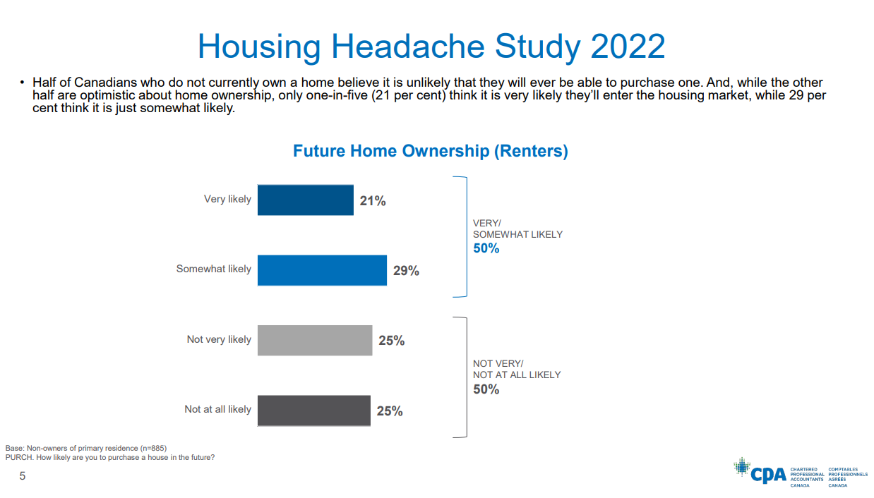 CPA Canada says half of non-homeowners surveyed believe it’s unlikely they ever will buy a home, 21 per cent think it’s very likely while 29 per cent view it as somewhat likely.