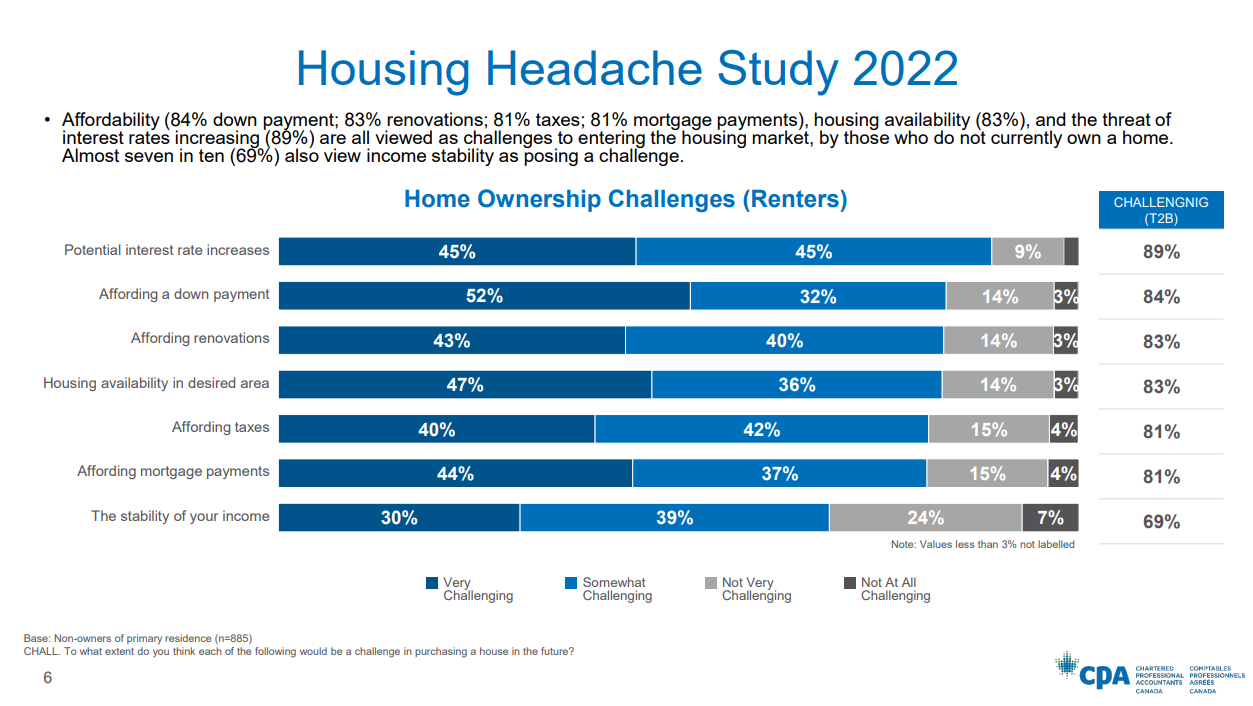 Eighty-four per cent of respondents cite down-payment affordability as another significant challenge, followed by taxes and mortgage payments at 81 per cent and income stability at 69 per cent.